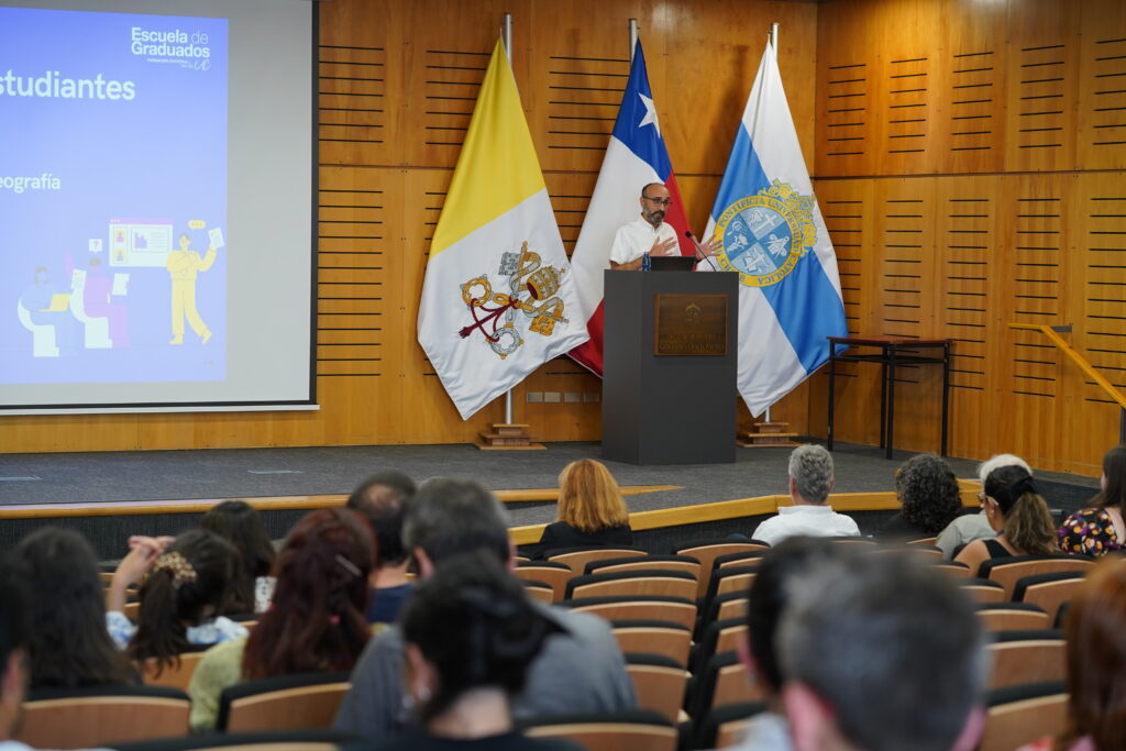 La recepción se realizó este 18 de marzo, en el auditorio de la Facultad, y contó con la participación de los tres directores de instituto, de académicos, estudiantes y también con una exposición a cargo de la Escuela de Graduados UC en la que se entregó información sobre recursos de apoyo para las y los estudiantes, financiamiento, becas y otros aspectos fundamentales para el desarrollo de sus programas.
